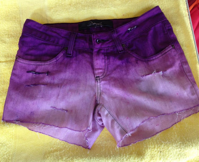 4º Passo) Tingir o shorts, usa-se um potinho inteiro de tinta de tecido mesmo, que pode ser encontrada em mercados e papelarias, eu optei por fazer na cor lilás, e em degradé, com o cós mais escuro, assim cada parte do shorts ficou um tempo na água, e conforme eu queria deixar mais escura a cor, ia aumentando a quantidade de tinta. Eu só coloquei o shorts depois que ele estava seco, achei que a tinta pega melhor assim.