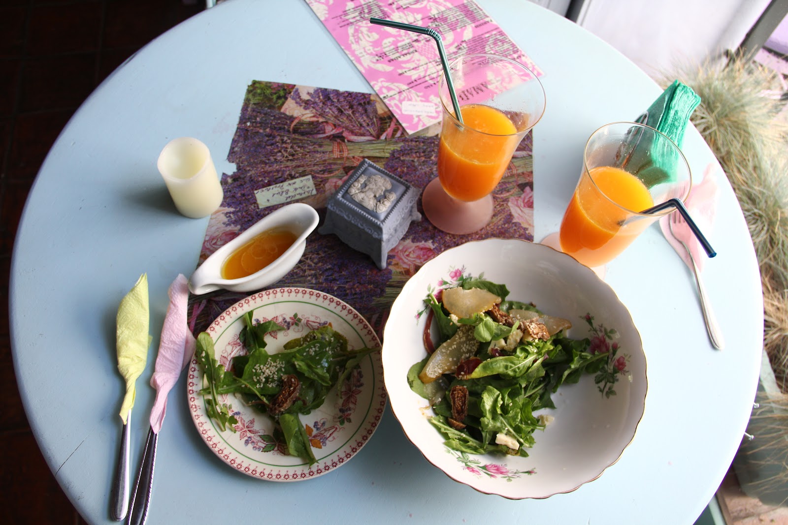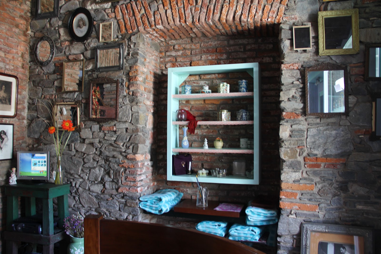 A primeira coisa que adorei foi a elegante decoração, com movéis antigos em tons pasteis e cores de bebê compondo as mesa e as cadeiras (lilás, verde água e azul clarinho), as paredes de tijolinhos e pedras, com um enorme espelho e muito detalhes, como quadros de fotos e objetivos de viagem e de costura. Há também um armário de louças e um barzinho com ar vintage, o ambiente é realmente uma graça!