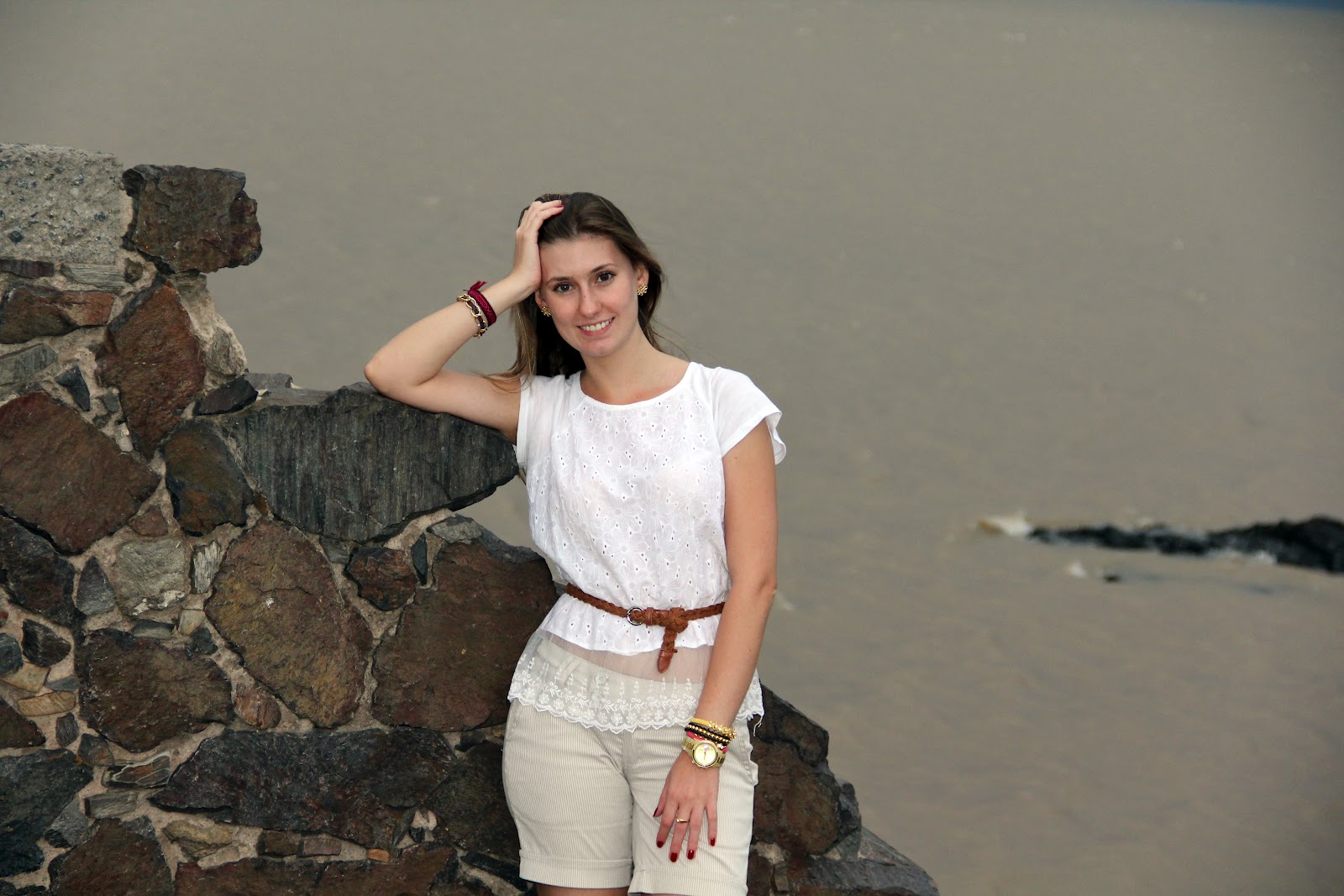 Quis usar uma roupa básica mas ao mesmo tempo mais elegantezinha, já que iríamos ficar para jantar, então apostei em um bermuda clara mais socialzinha e blusa de renda branca, com um cintinho marrom, oxford azul e bolsa vermelha. Adoro a combinação de azul com vermelho, tanto em acessórios como em peças de roupas também!