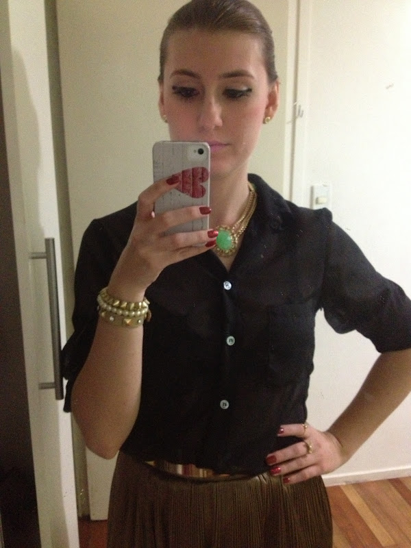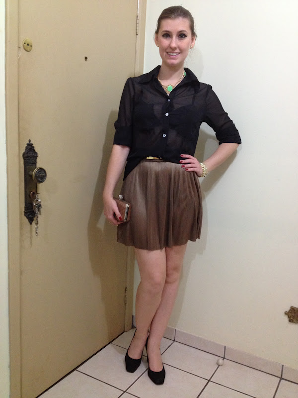 Começando o mês com mais um look do dia! Usei para ir em um barzinho, saia plissadinha e camisa preta transparente com cinto metálico, nos cabelos apostei em um coque simples, acho lindo e elegante o penteado, mas adoro usar o cabelo solto, então dificilmente prendo, mas neste dia estava com vontade de coque! E pra fugir um pouco da combinação do preto com o dourado, optei por um maxi colar com pedra verde.