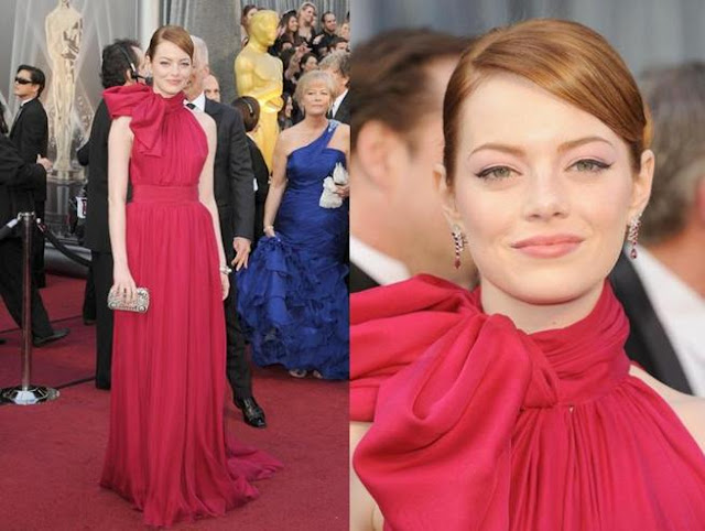 Emma Stone, linda de vermelho e com esse big laço no pescoço. Apesar do contraste com a cor do tapete, gosto de vestidos vermelho, acho que fica ótimo em peles claras como a dela. Ela veste Giambattista Valli.