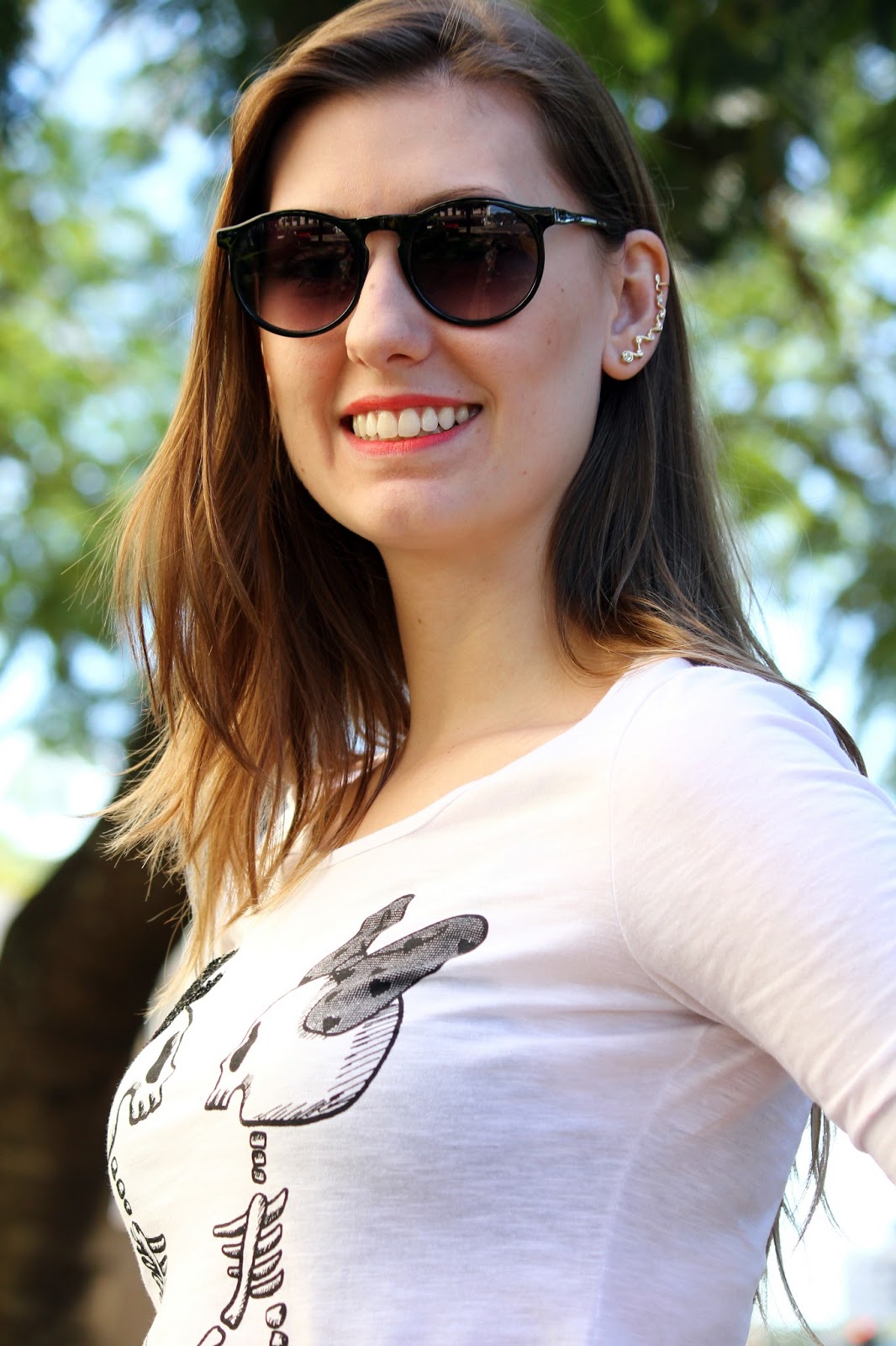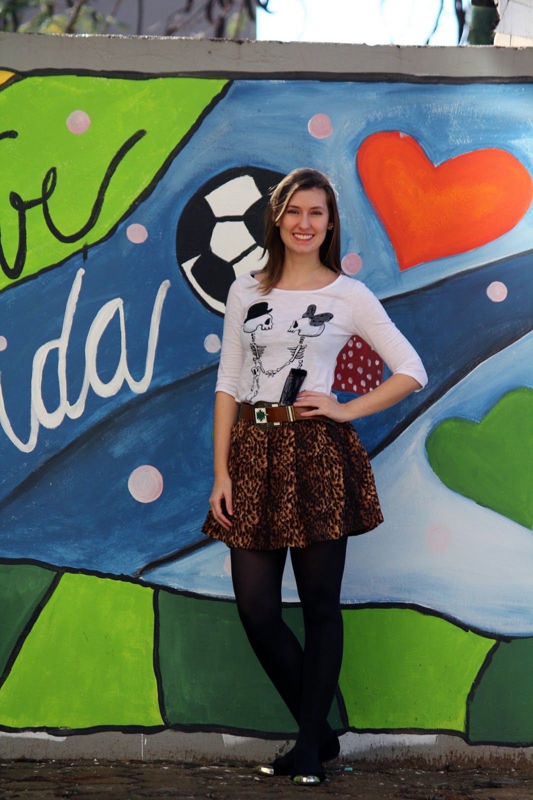 Boa noite gente! Hoje tem um look lindo no blog, que eu adorei usar! Saia de estampa animal print (será que sou viciada?!) com t-shirt super divertida de caveirinhas, acessórios como cinto apache, meia calça preta (é fio 60!) e sapatilha básica para valorizar o look. Nem tudo precisa de salto pra ficar elegante, né?! Peças chaves com peças neutras formam um belo visual, moderno e chique, e neste caso: confortável também! Adoro composições com meia calça, acho que deixa o look cheio de charme!